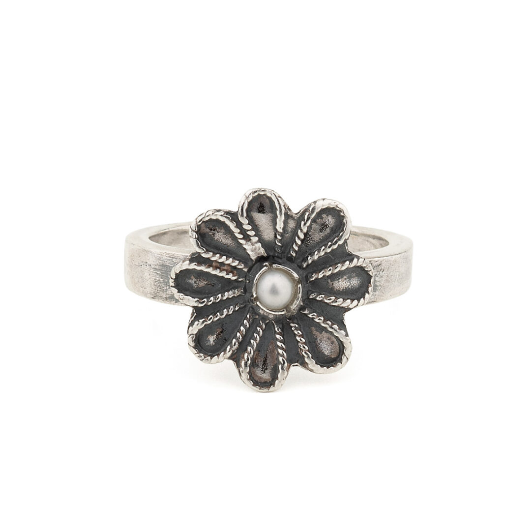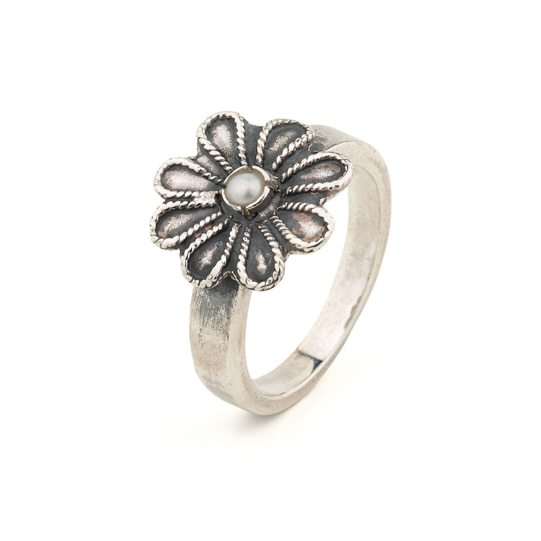 Δαχτυλίδι Vintage Ροζέτα – Οξειδωμένο Ασήμι & Μαργαριτάρι
