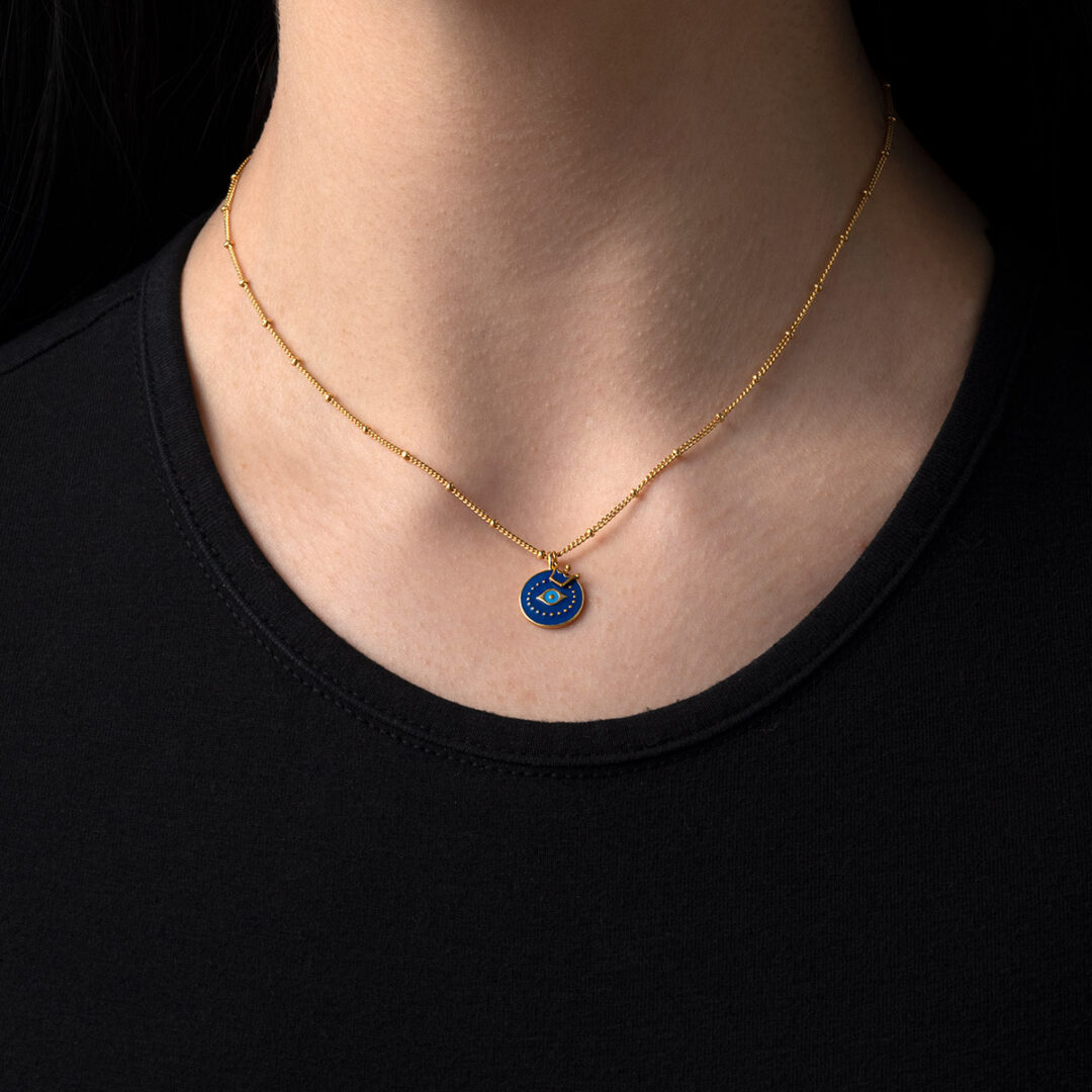 Κολιέ από ασήμι 925 επιχρυσωμένο, με αλυσίδα, χρωματιστό Δίσκο-Μάτι και μικρή Κορώνα.