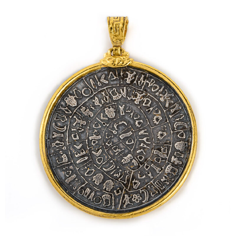 Minoan Phaistos Disc pendant. The Phaistos Disc is a disk of fired clay from the Minoan palace of Phaistos on the island of Crete. Now, the island of Crete is part of modern Greece. The disc was discovered in 1908 by the Italian archaeologist Luigi Pernier in the Minoan palace-site of Phaistos. While it is not clear that it is a script, most attempted decipherments assume that it is; most additionally assume a syllabary, others an alphabet or logography or a calendar.