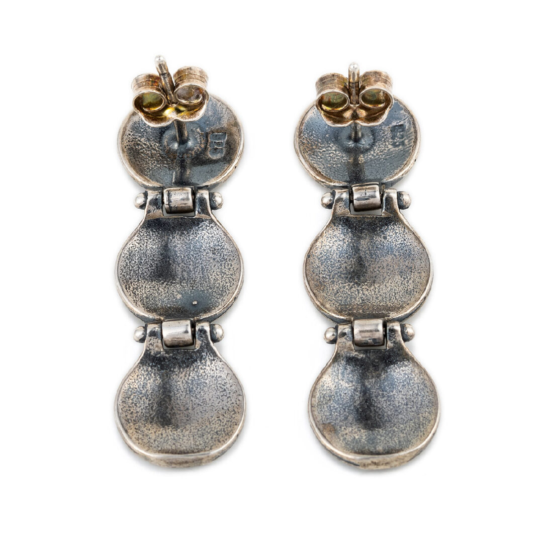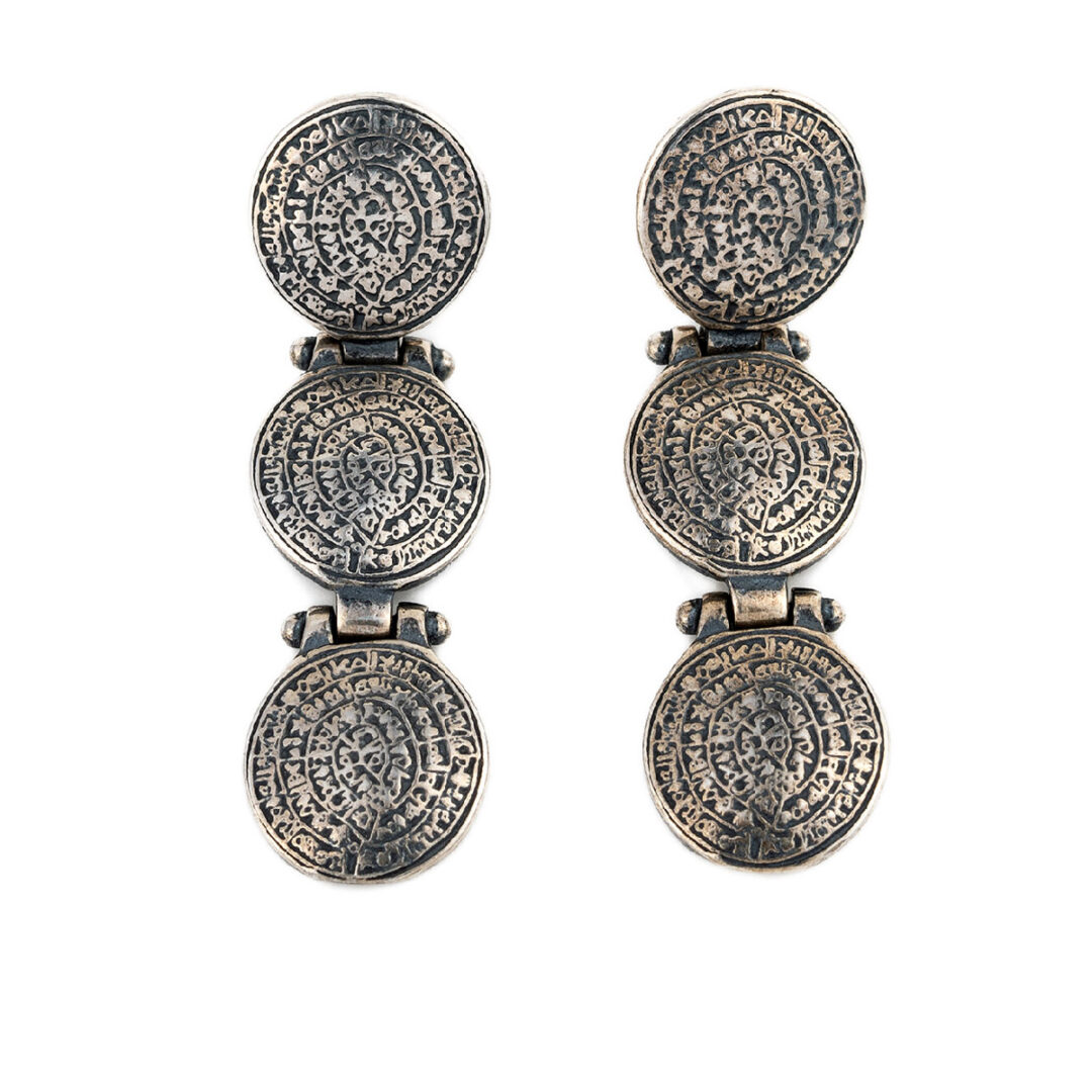 This beautiful pair of earrings representing the disc of Phaistos. The Phaistos Disc is a disk of fired clay from the Minoan palace of Phaistos on the island of Crete. Now, the island of Crete is part of modern Greece. The disc was discovered in 1908 by the Italian archaeologist Luigi Pernier in the Minoan palace-site of Phaistos. While it is not clear that it is a script, most attempted decipherments assume that it is; most additionally assume a syllabary, others an alphabet or logography or a calendar, making it one of the most famous mysteries of archaeology. The disk is about 15 cm in diameter and covered on both sides with a spiral of stamped symbols. The disc features 241 tokens, comprising 45 distinct signs, which were apparently made by pressing hieroglyphic “seals” into a disc of soft clay, in a clockwise sequence spiraling toward the center of the disk. This unique object is now on display at the archaeological museum of Heraklion.