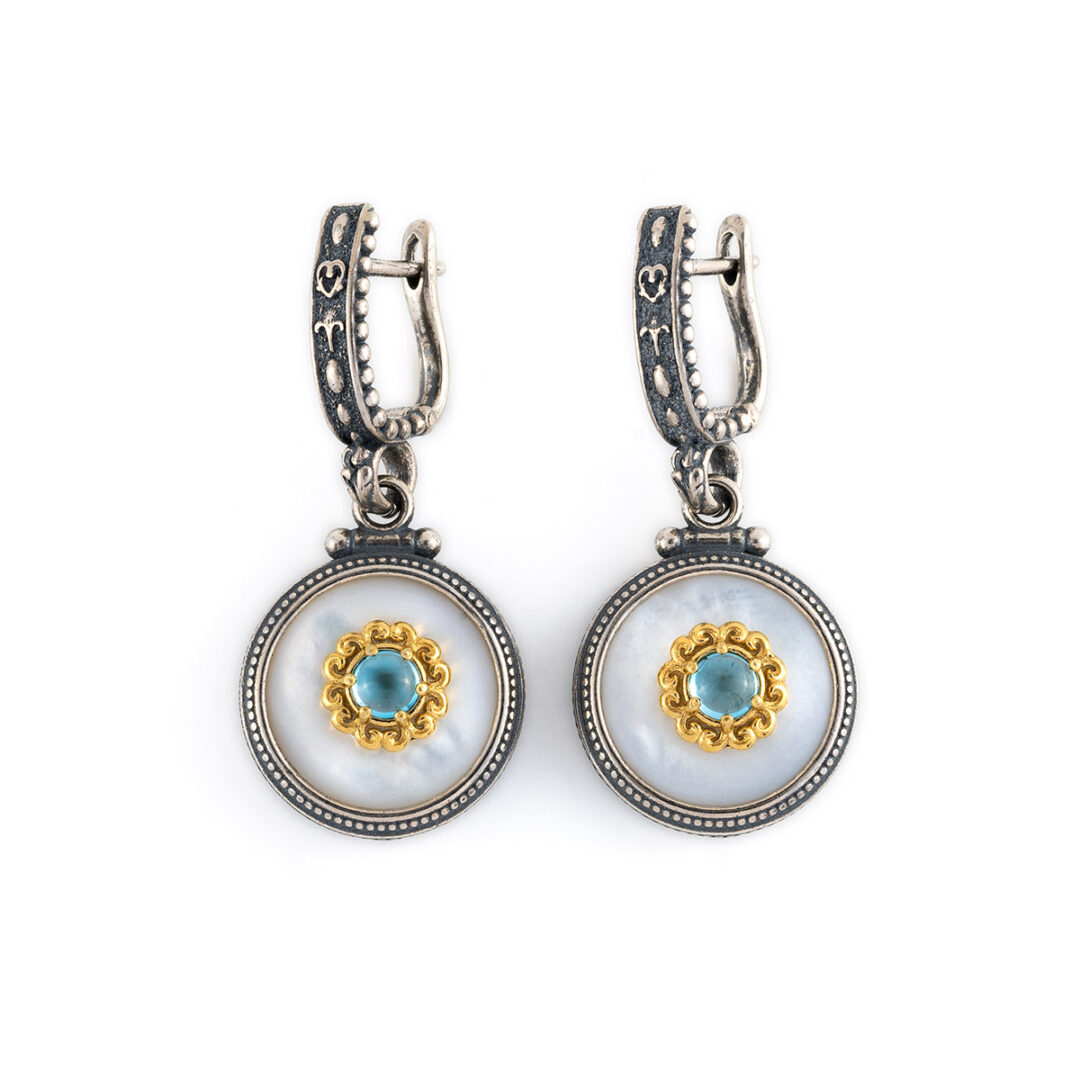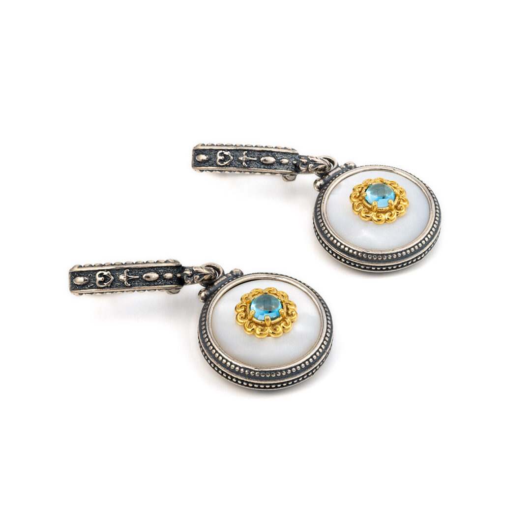 Αυτά τα σκουλαρίκια είναι εμπνευσμένα από τη βυζαντινή ιστορική περίοδο με σεβασμό στην ελληνική παραδοσιακή τέχνη. Ένα πολύ κομψό ζευγάρι σκουλαρίκια διακοσμημένα με μπλε τοπάζι.