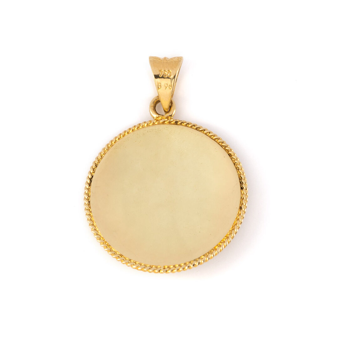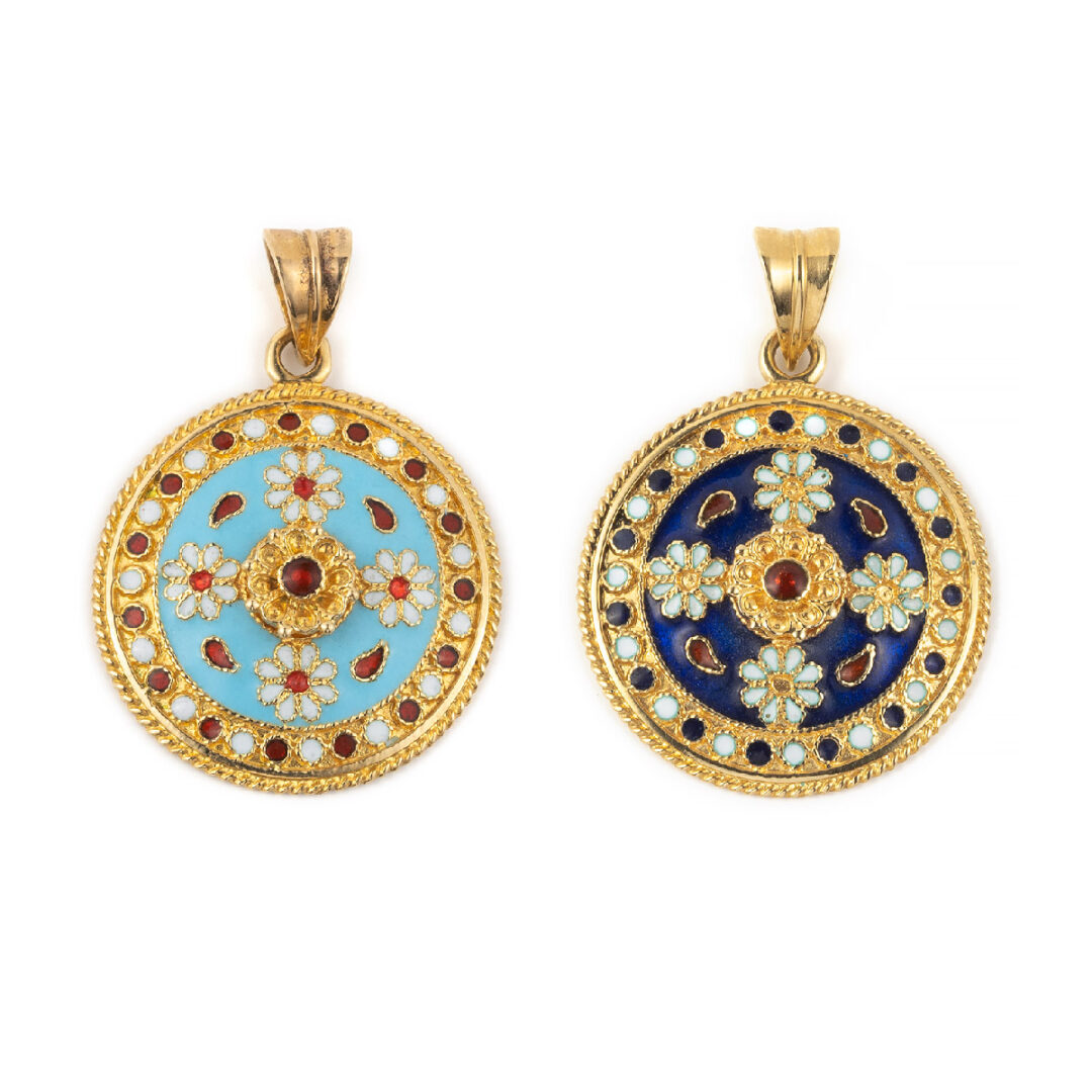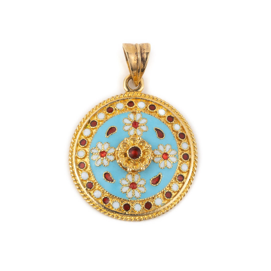 Ancient Greek Round Pendant with floral motif (four rosette motifs). The pendant is decorated with blue & red enamel and granules of precious metal.  The back side of the pendant has no decoration.
