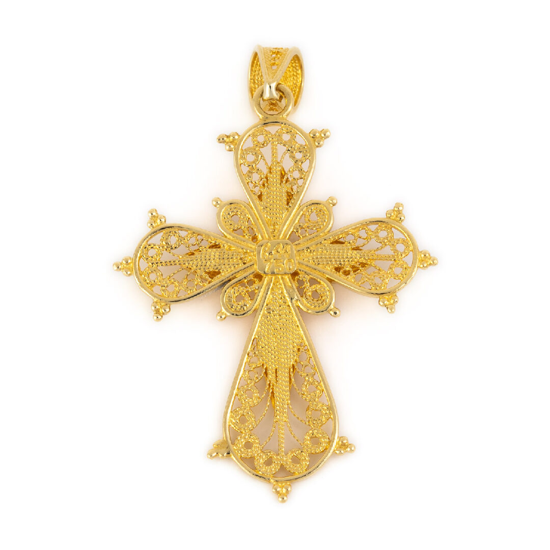 Byzantine Cross embellished with a fine filigree, an emerald gemstone in the middle and granules of precious metal.