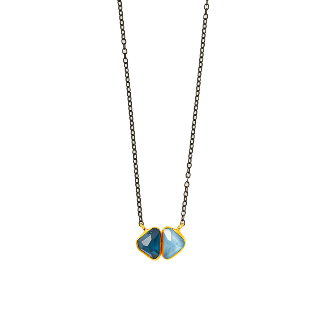 This stunning necklace features an aquamarine and a blue topaz stone.