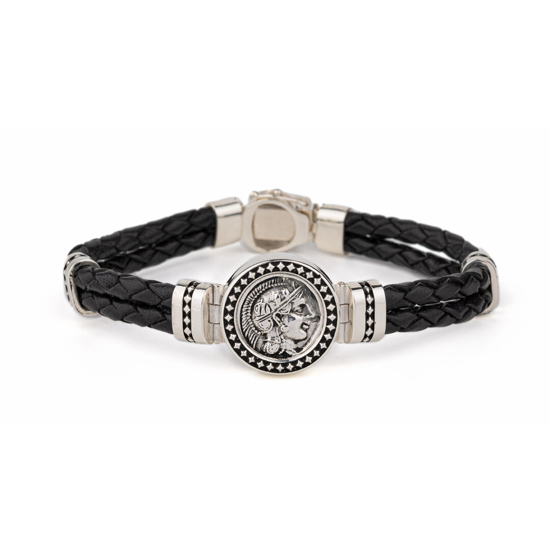 Sterling Silver Bracelet with genuine black leather insert and Goddess coin.