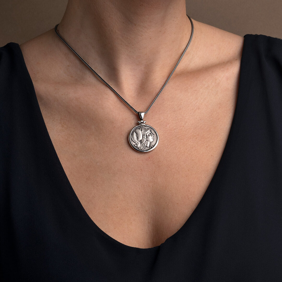 The pendant bears the ancient Greek tetradrachm, depicting Athena and her symbol, the wise Owl.