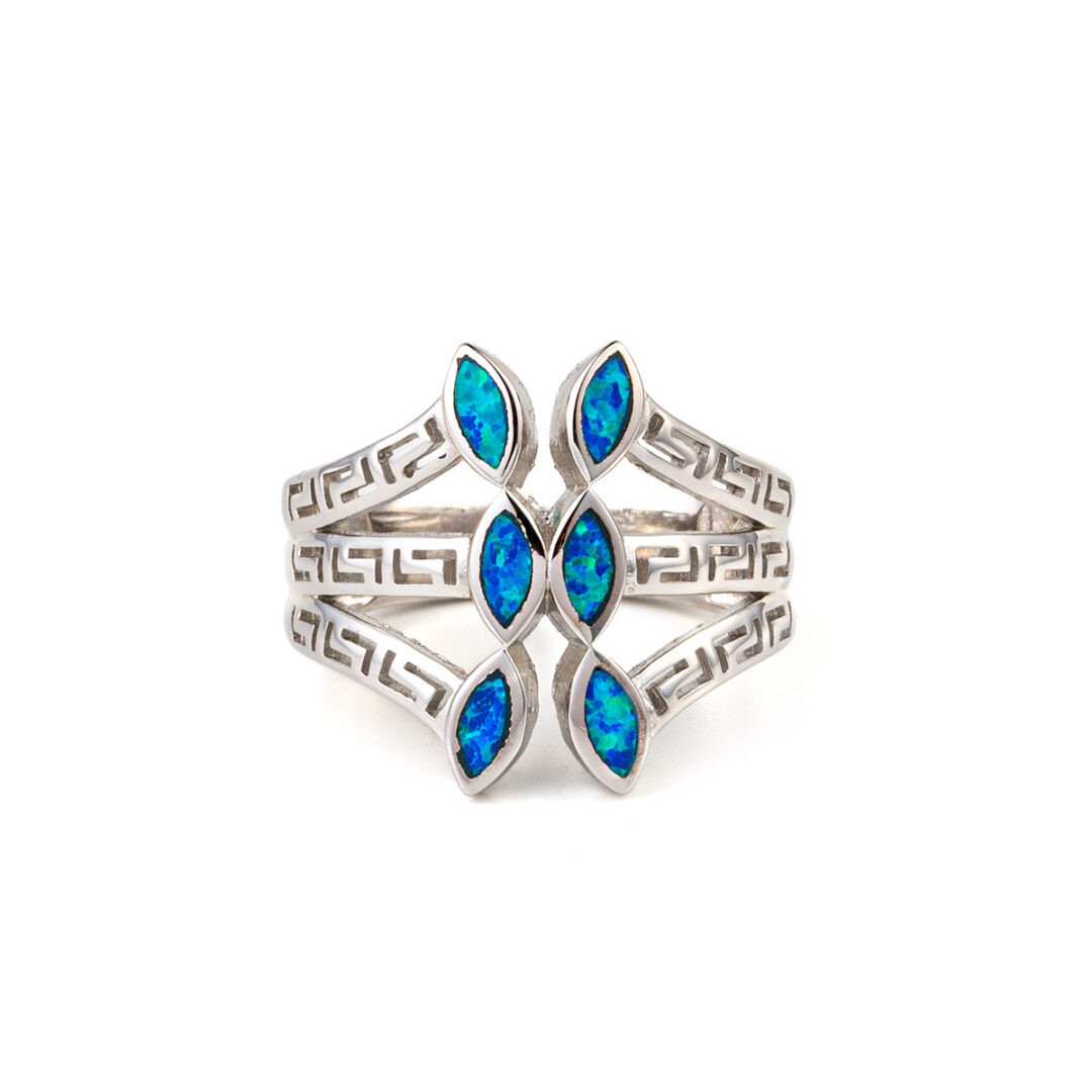 Blue Opal Leaf Greek Key Ring- 925 Sterling Silver