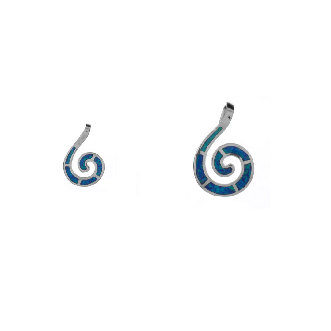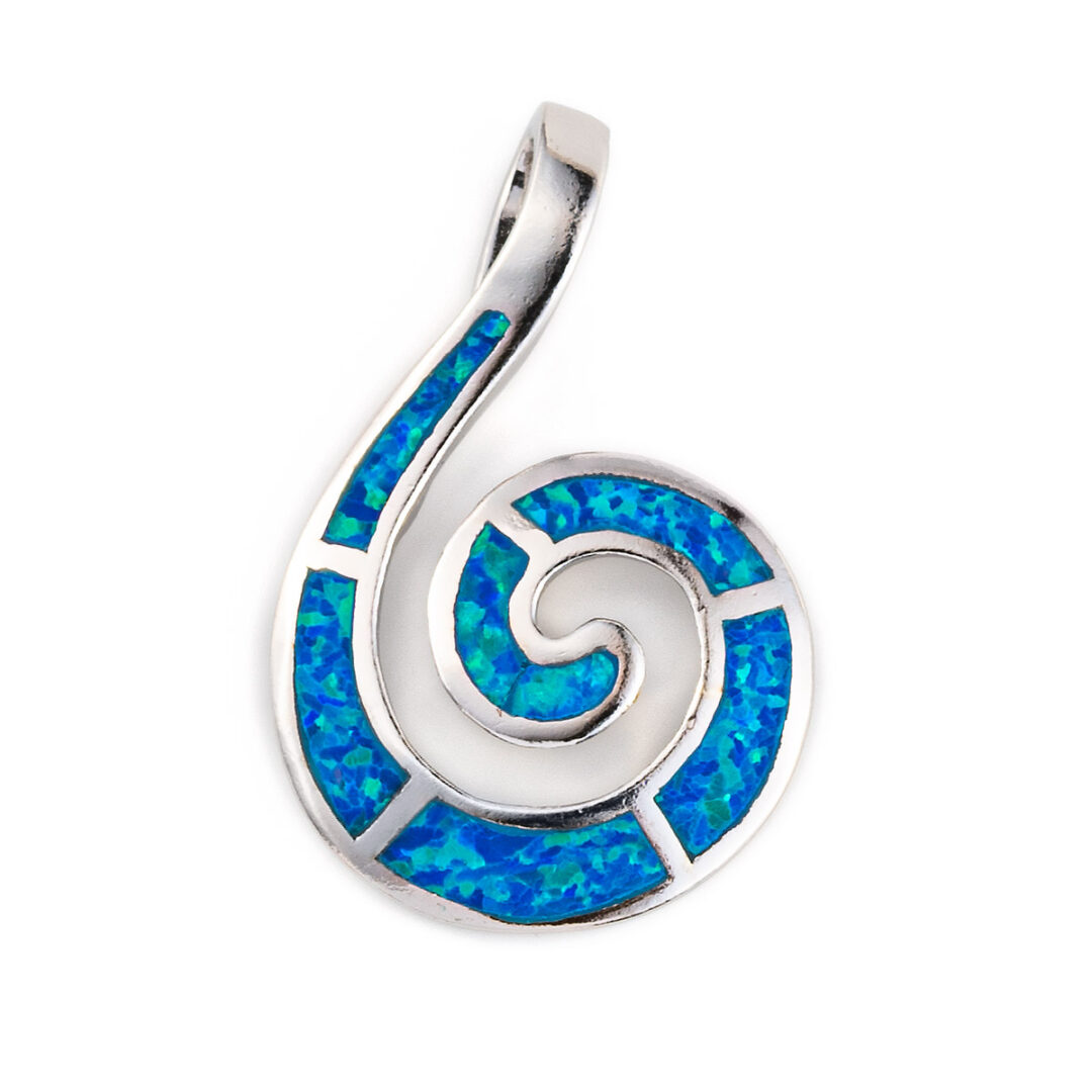 A sterling silver pendant featuring the spiral symbol with a blue opal stone.