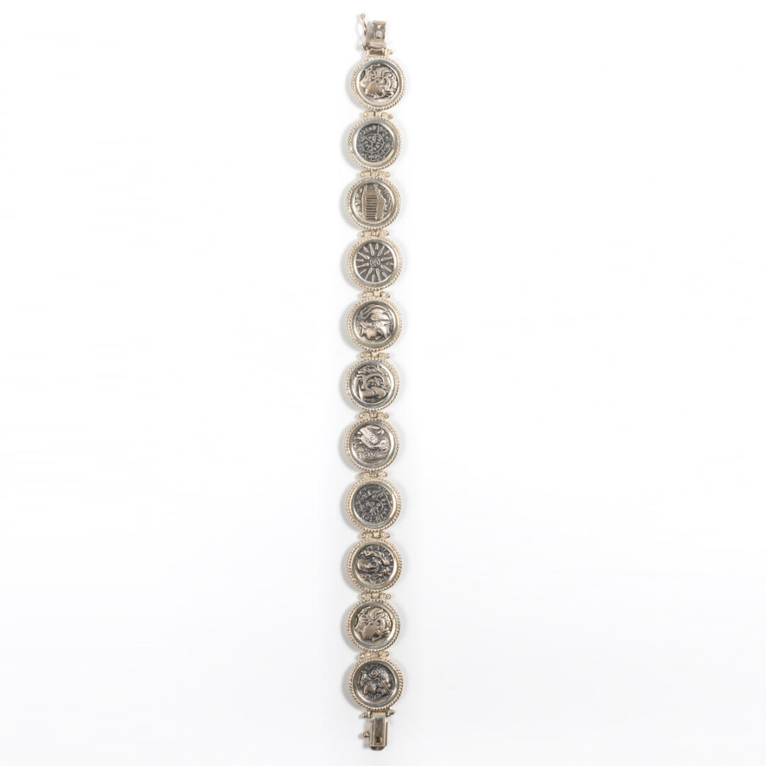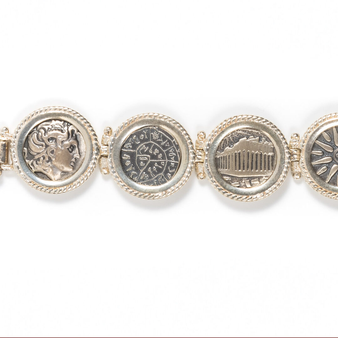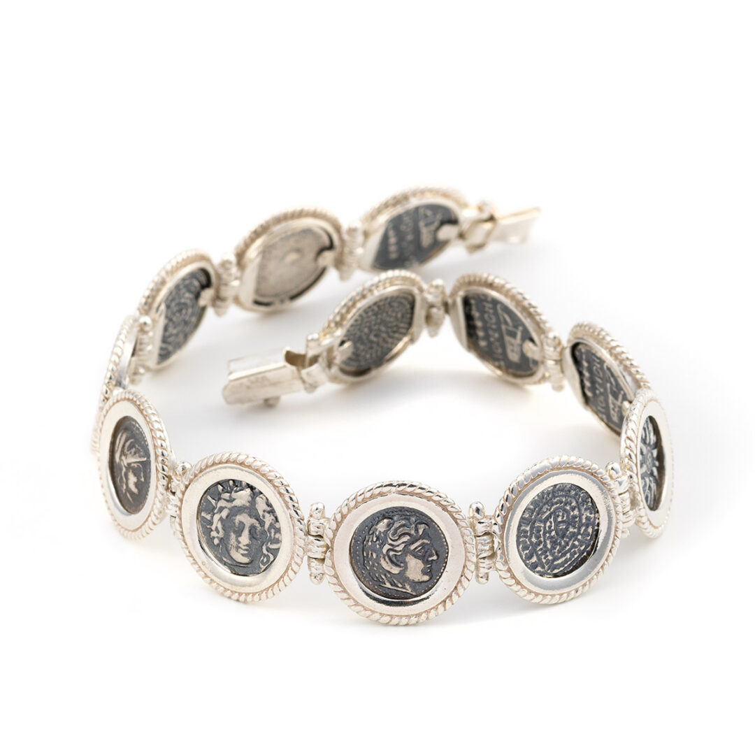 This is a beautiful silver bracelet with ancient coins (replicas) representing different symbols from ancient Greek history and mythology (Spiral Of Life, ancient Greek Gods).