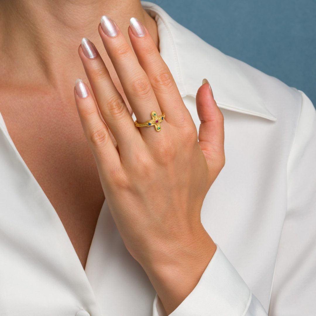 Byzantine Cross Ring in 925 Sterling Silver Gold Plated with Multicolor Zircons