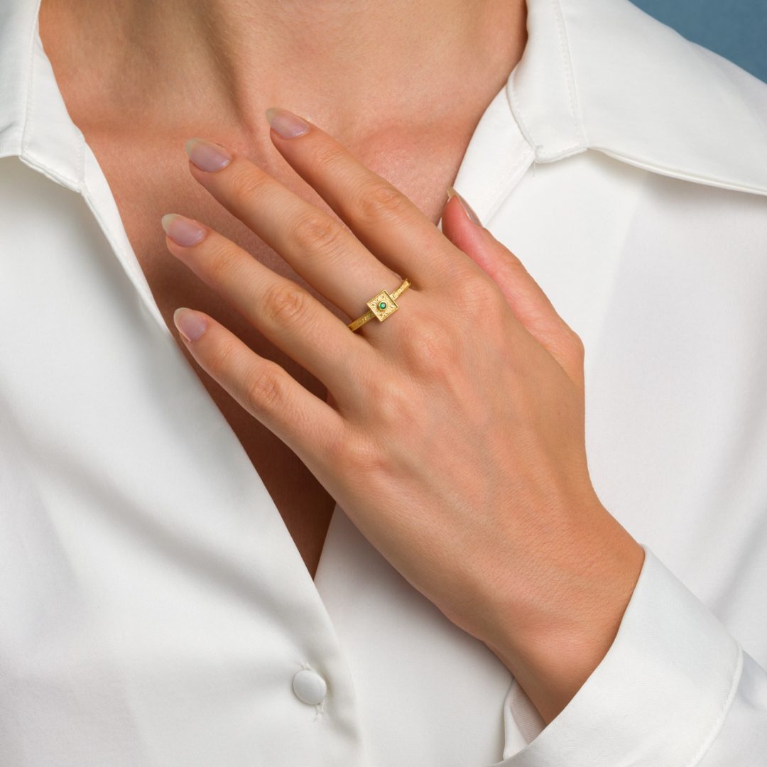Byzantine Square Ring in 925 Sterling Silver Gold Plated with Round Zircon