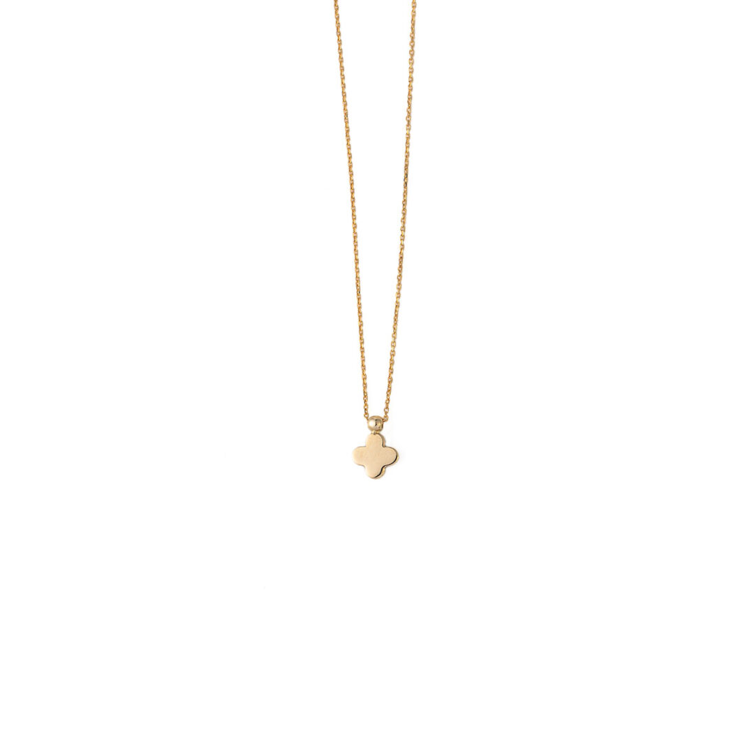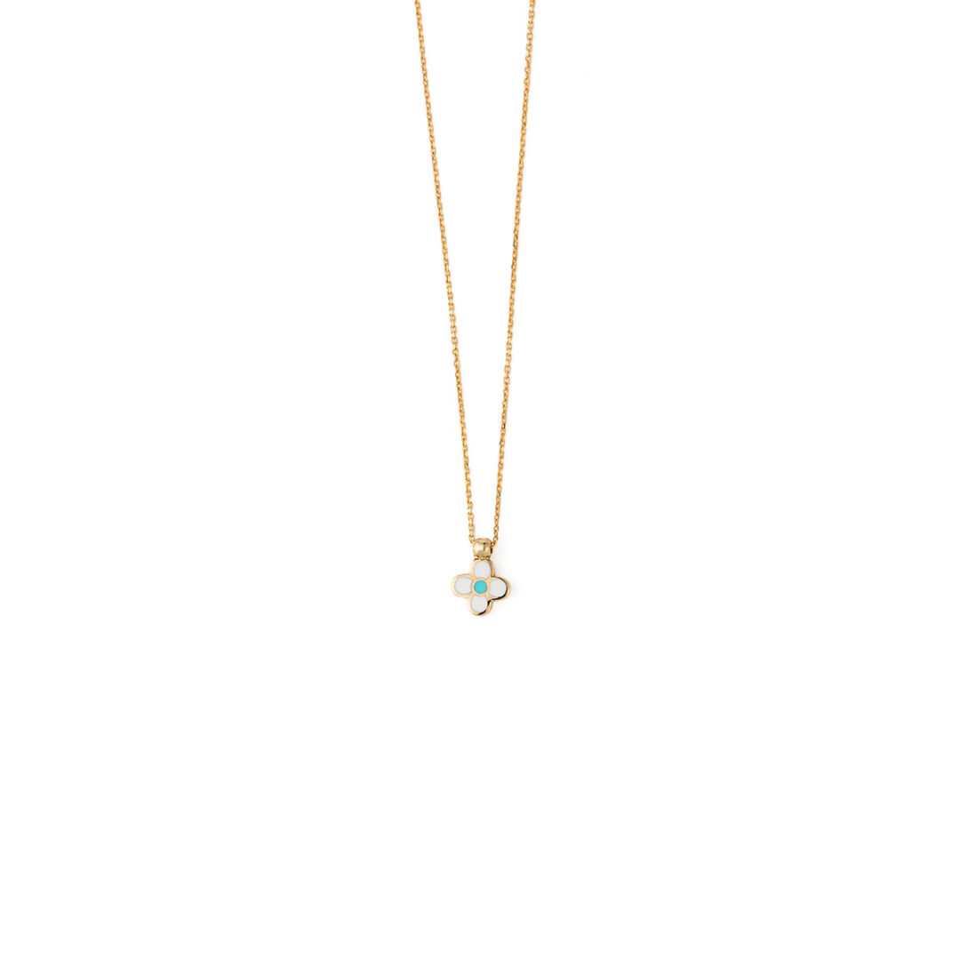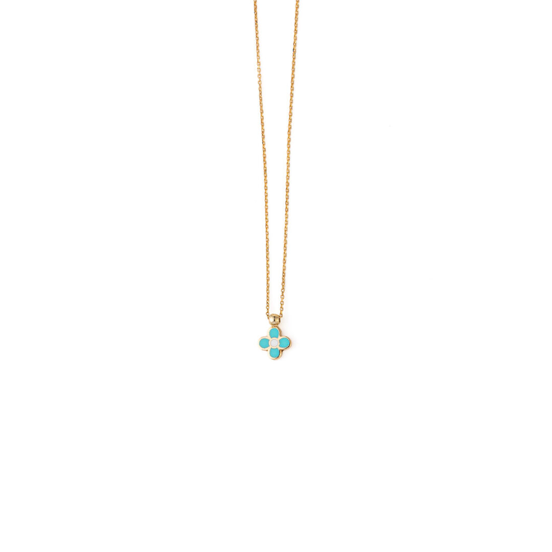 The necklace features a classic cross pendant, with the surface of the cross filled with enamel. The enamel is available in various colors, such as vibrant turquoise or classic white, providing a sleek, polished look that contrasts beautifully with the warm tones of the 14K gold.