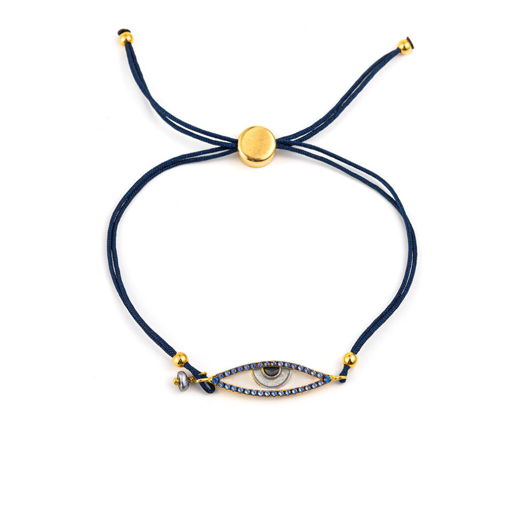 Cordon bracelet with zircon-embellished eye with enamel iris, beads and stone. The size is adjustable with this special clasp.