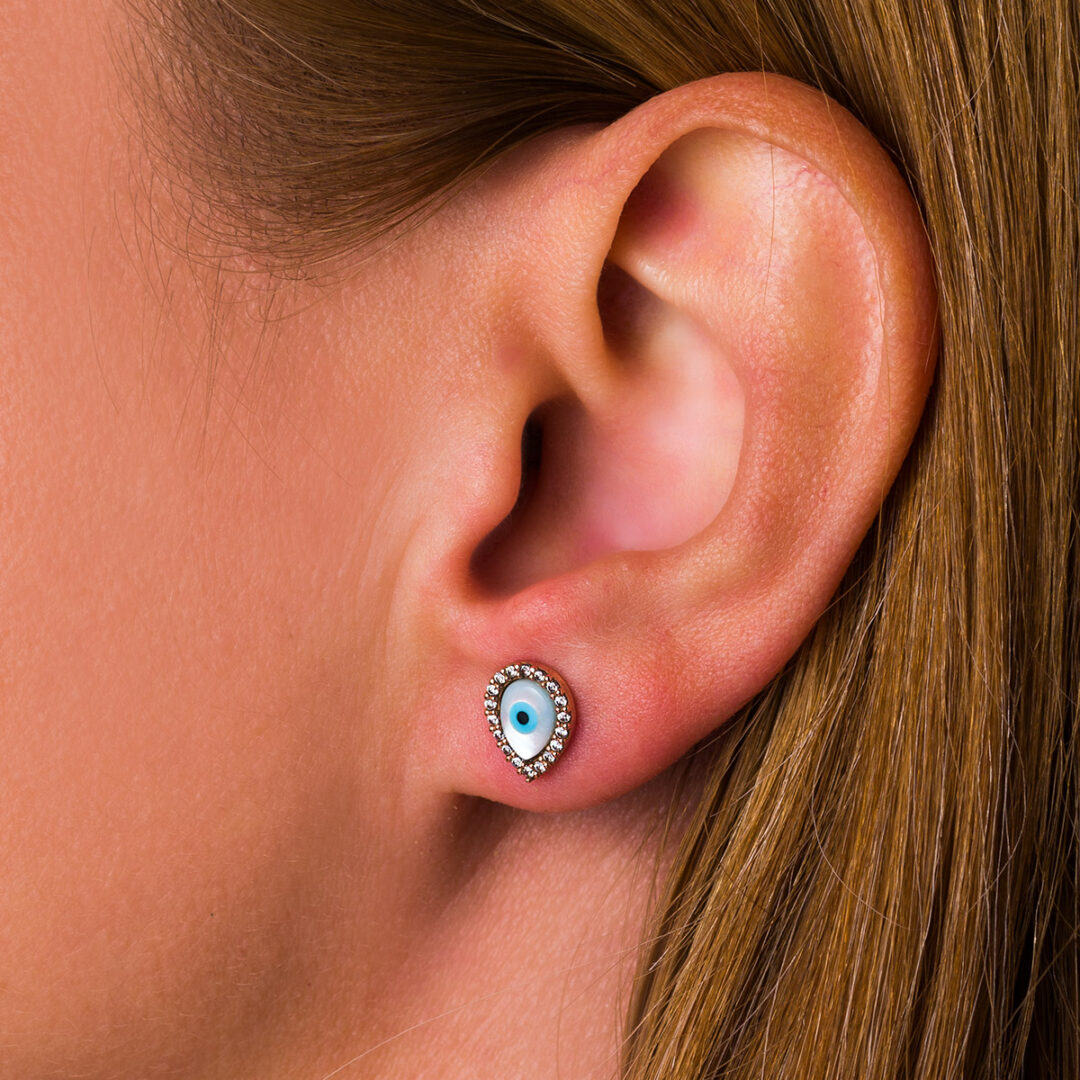 A beautiful pair of evil eye stud earrings! It is made of 9K rose gold and decorated with zircon.