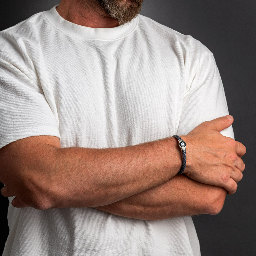 Sterling silver bracelet with lucky eye motif. Genuine braided black leather