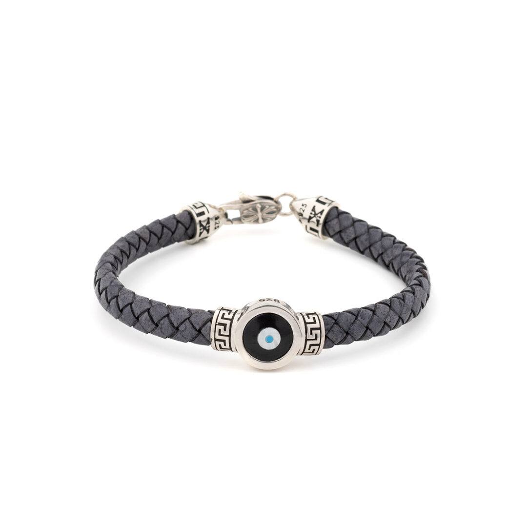 Evil Eye Leather Bracelet with Greek Key – 925 Sterling Silver