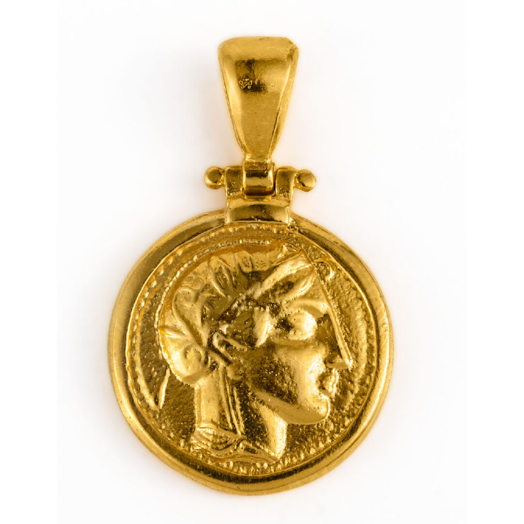 The pendant bears the ancient Greek tetradrachm, depicting Athena and her symbol, the wise Owl.