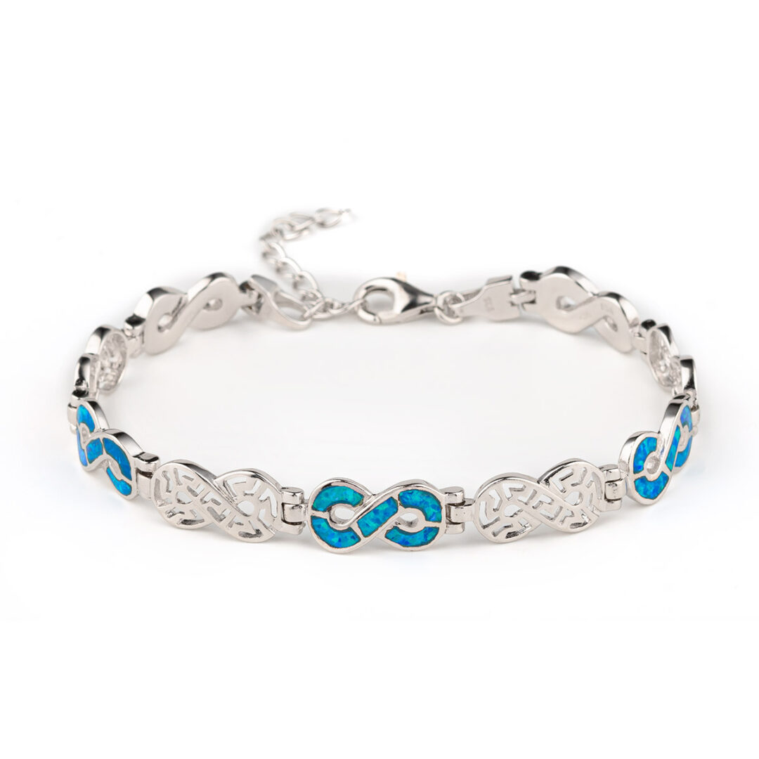 A sterling silver bracelet inspired by the ancient Meander motif with bright blue opal gems.