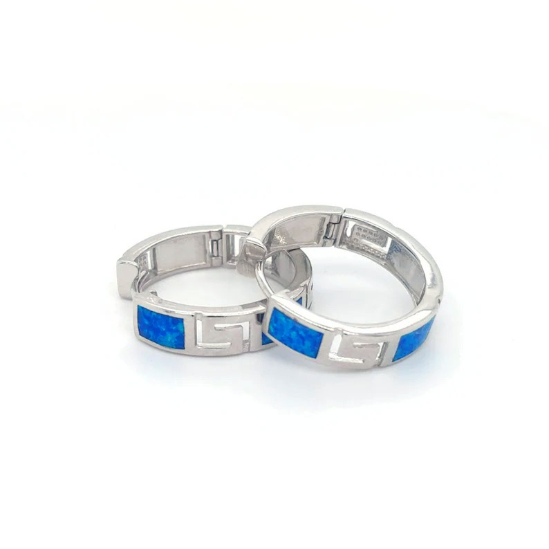 925 sterling silver hoop meander earrings featuring a Meander or Greek Key pattern with blue opal gemstones.