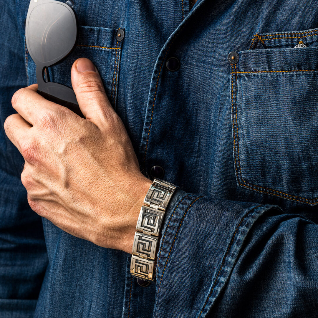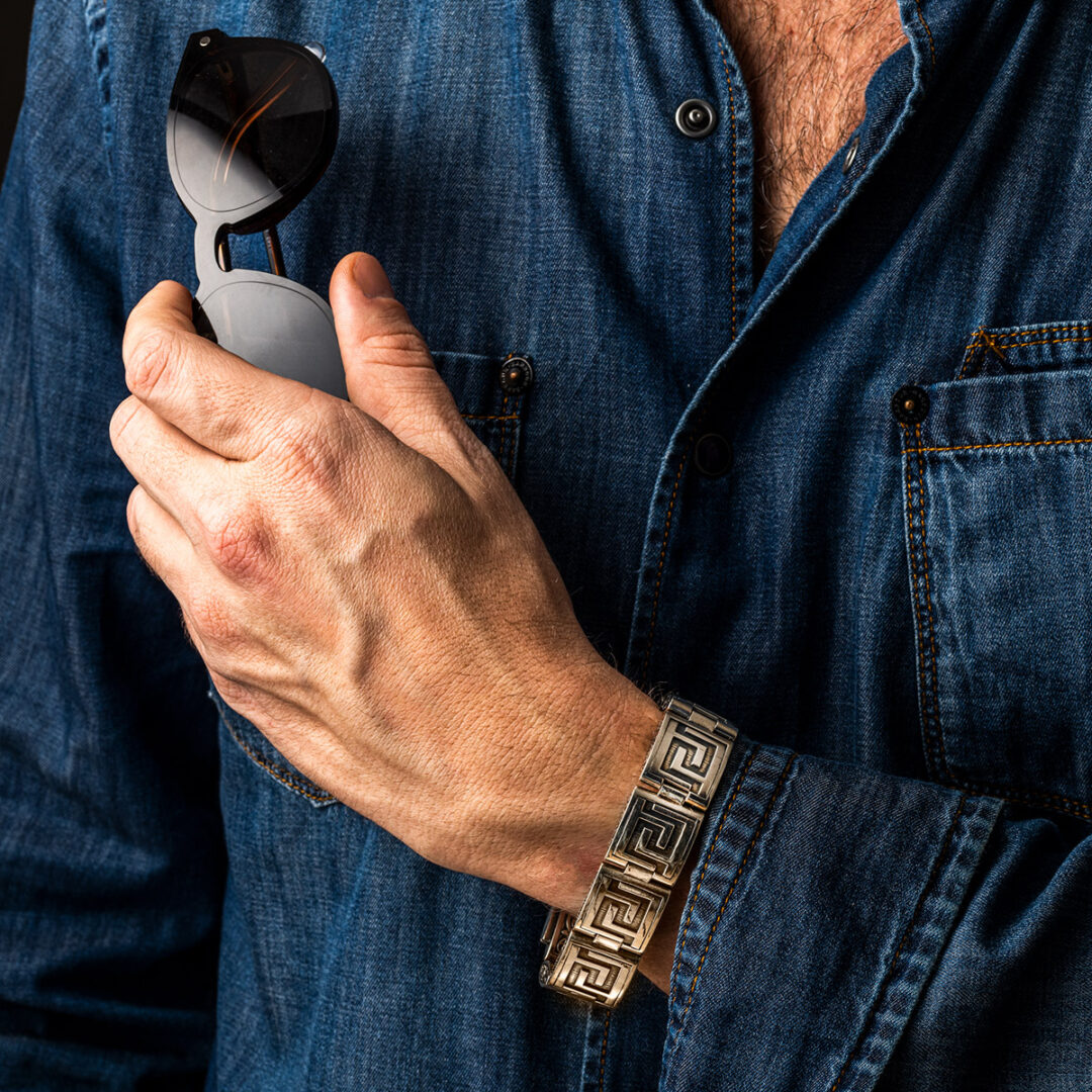 Two-sided bracelet. On one side, the bracelet is decorated with the Ancient Greek meander symbol and Byzantine motifs on the other.
