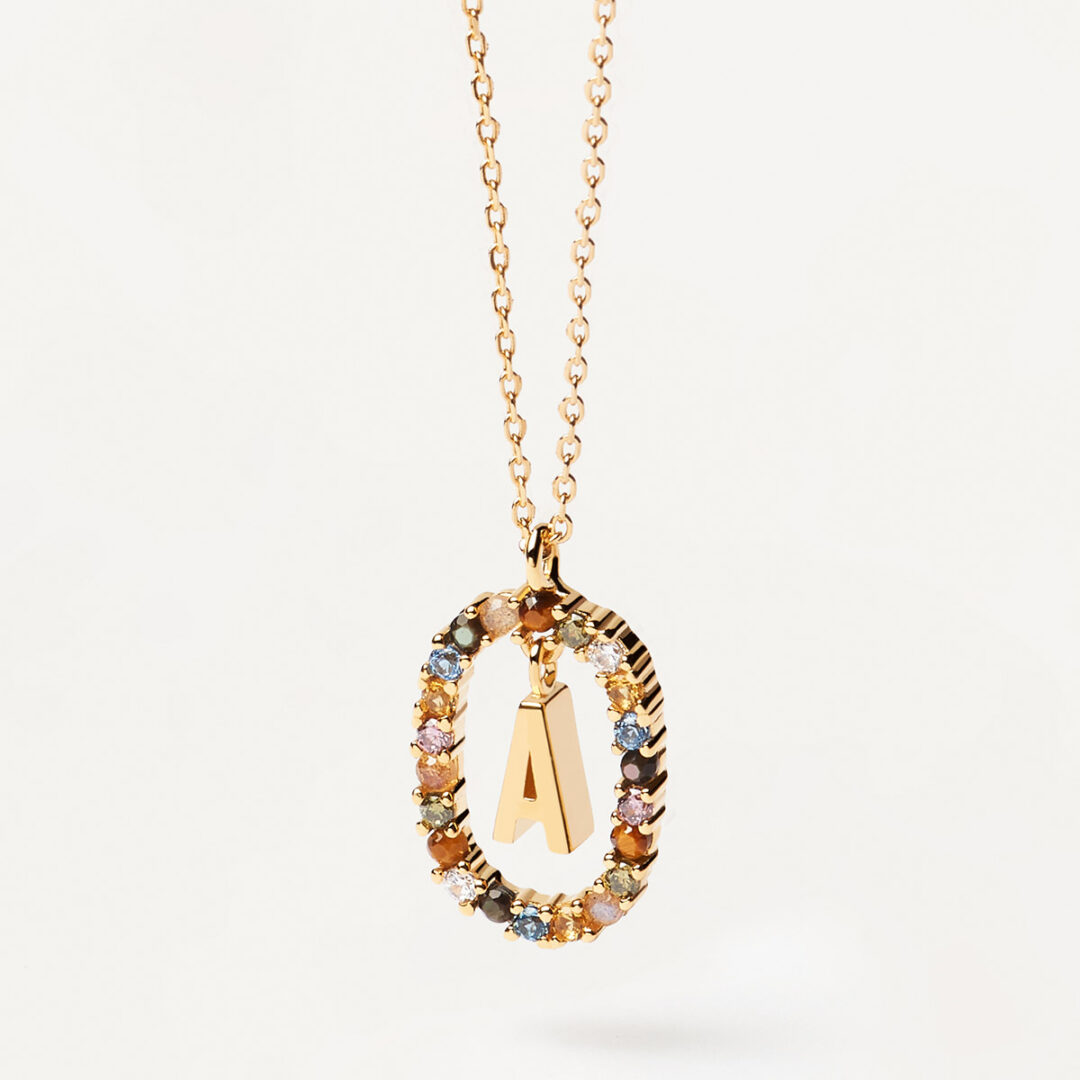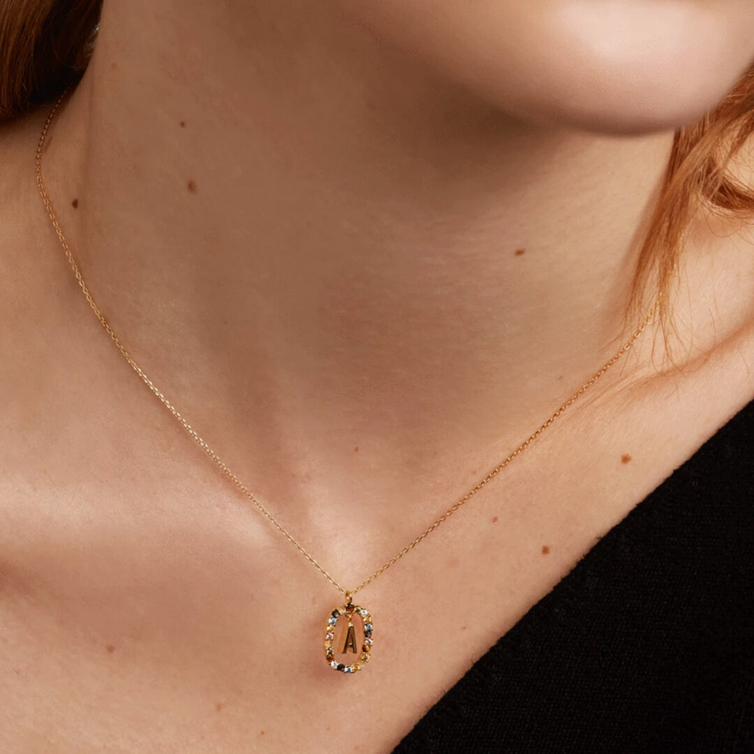 Labradorite, Tiger Eye, Mother of Pearl and crystals blend in a bright squarish oval that saves your initial like a treasure, giving life to a necklace design that will become the timeless icon of your own. Like floating in the air, an 18k gold plated initial hangs inside the amulet, a prominent piece made of 925 silver as your ultimate bold statement. Surrounding color hues and veins in the natural gemstones are singular characteristics in each necklace, making every letter genuinely unique in the world.