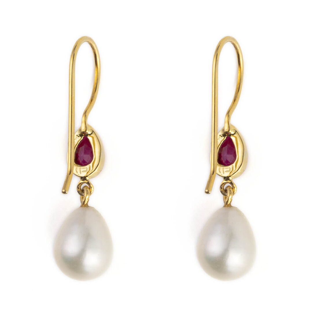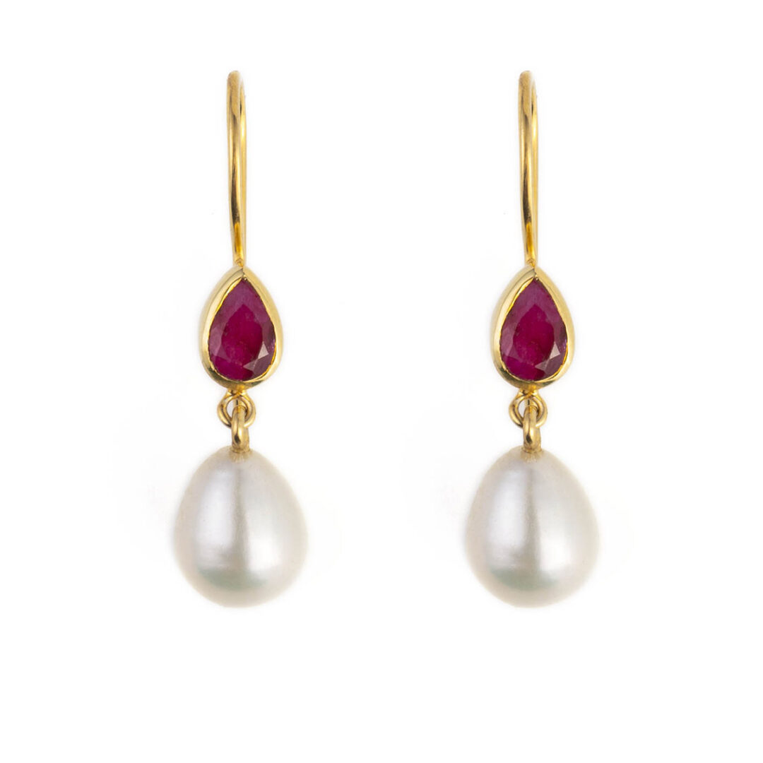 A beautiful pair of earrings decorated with Rubinite and Pearl stones.