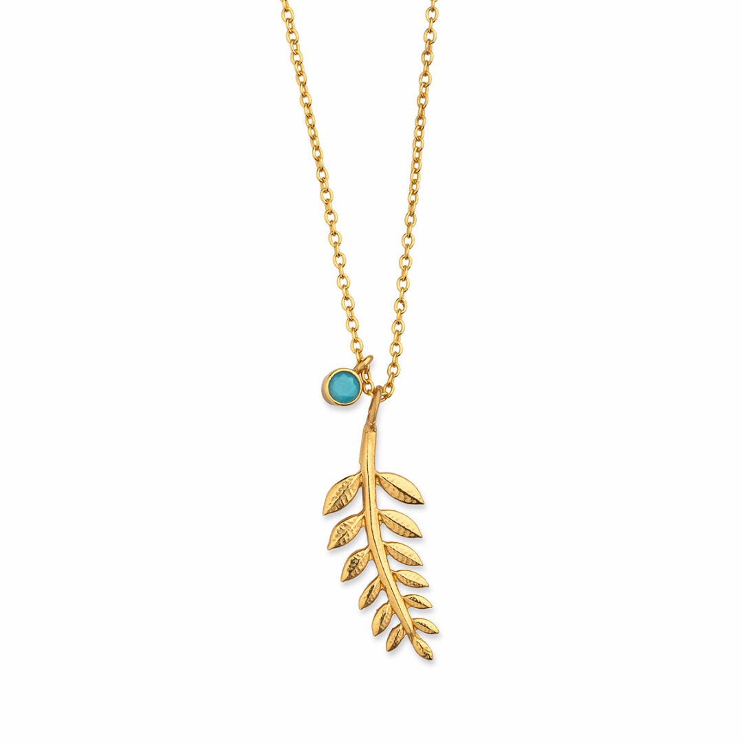 Sterling silver ruthenium plated chain necklace with gold plated hanging fern and turquoise setting. By the end of the chain there is a metal purity tag with logo and a second link to adjust length.