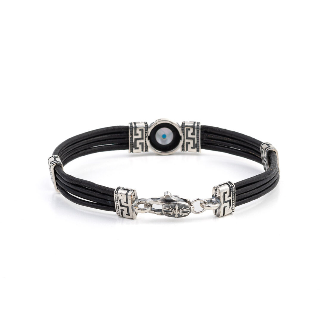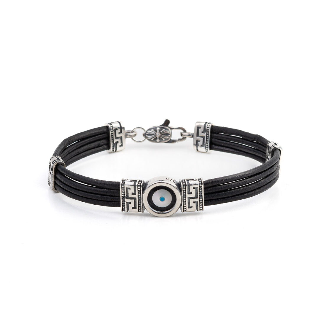 Sterling Silver Leather Bracelet with Lucky Eye Motif and Meander