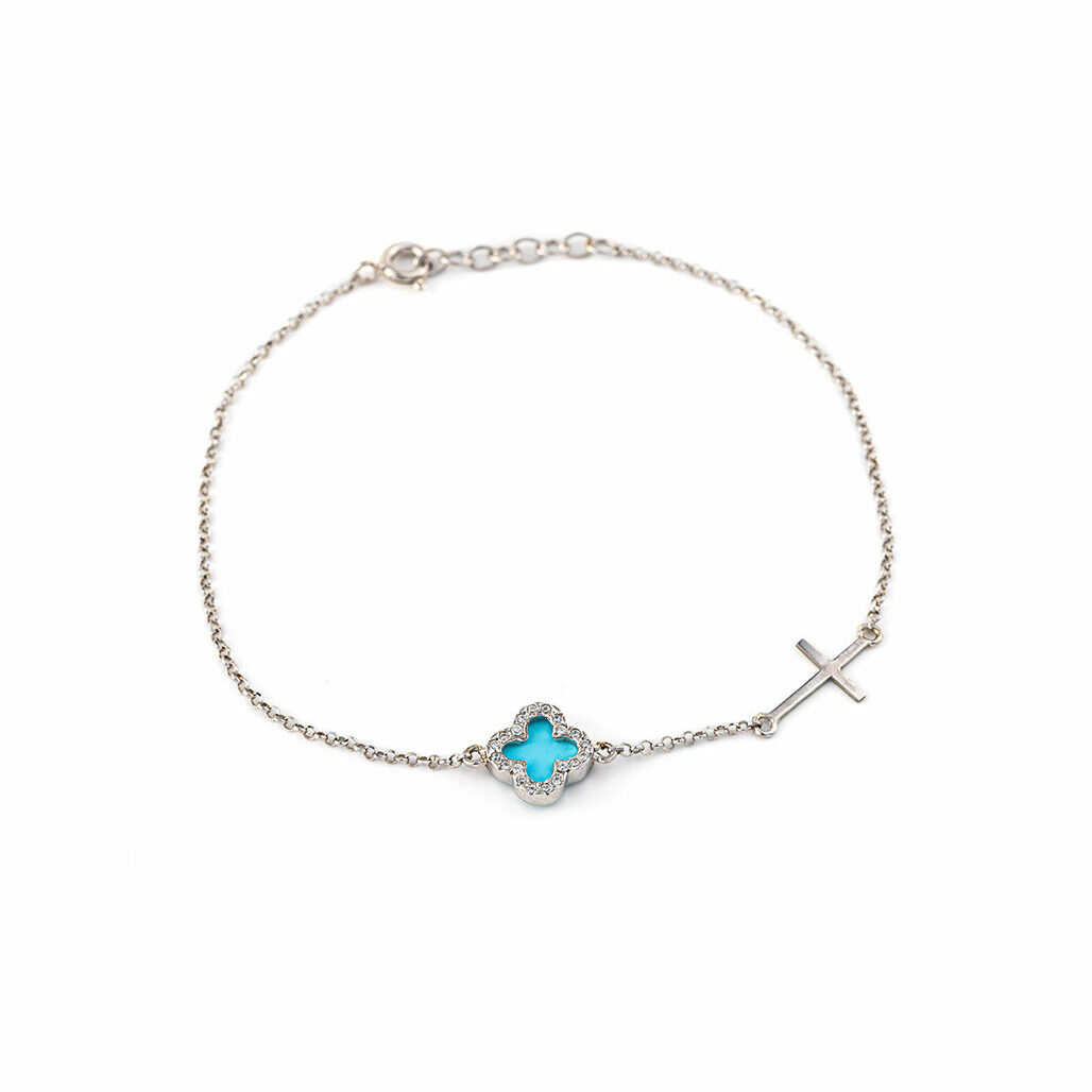 Sterling silver chain bracelet with turquoise cross adorned with white zircon stones.