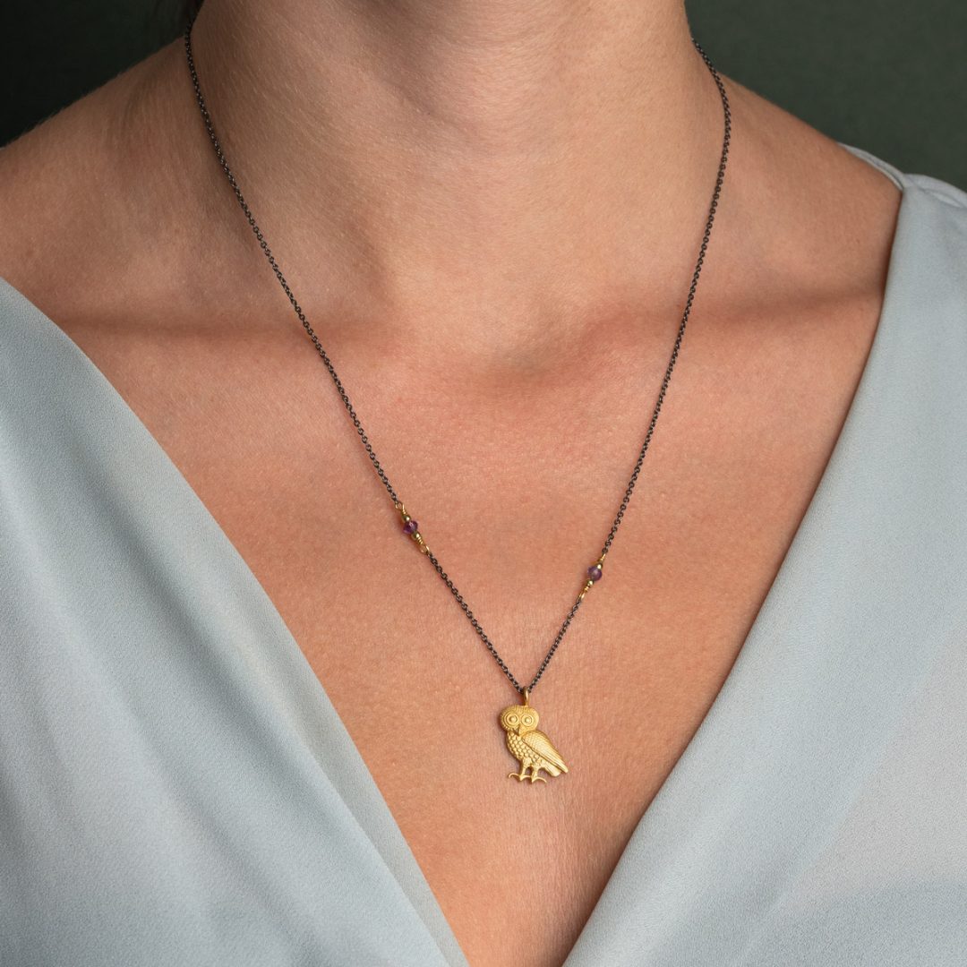 This necklace is inspired by the Ancient Greek jewels which represent the symbol of the Wisdom Owl.